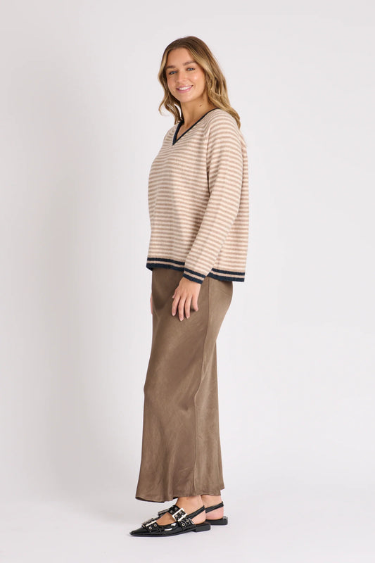 Ellis & Dewey V-Neck Raglan Jumper - Coffee Stripe