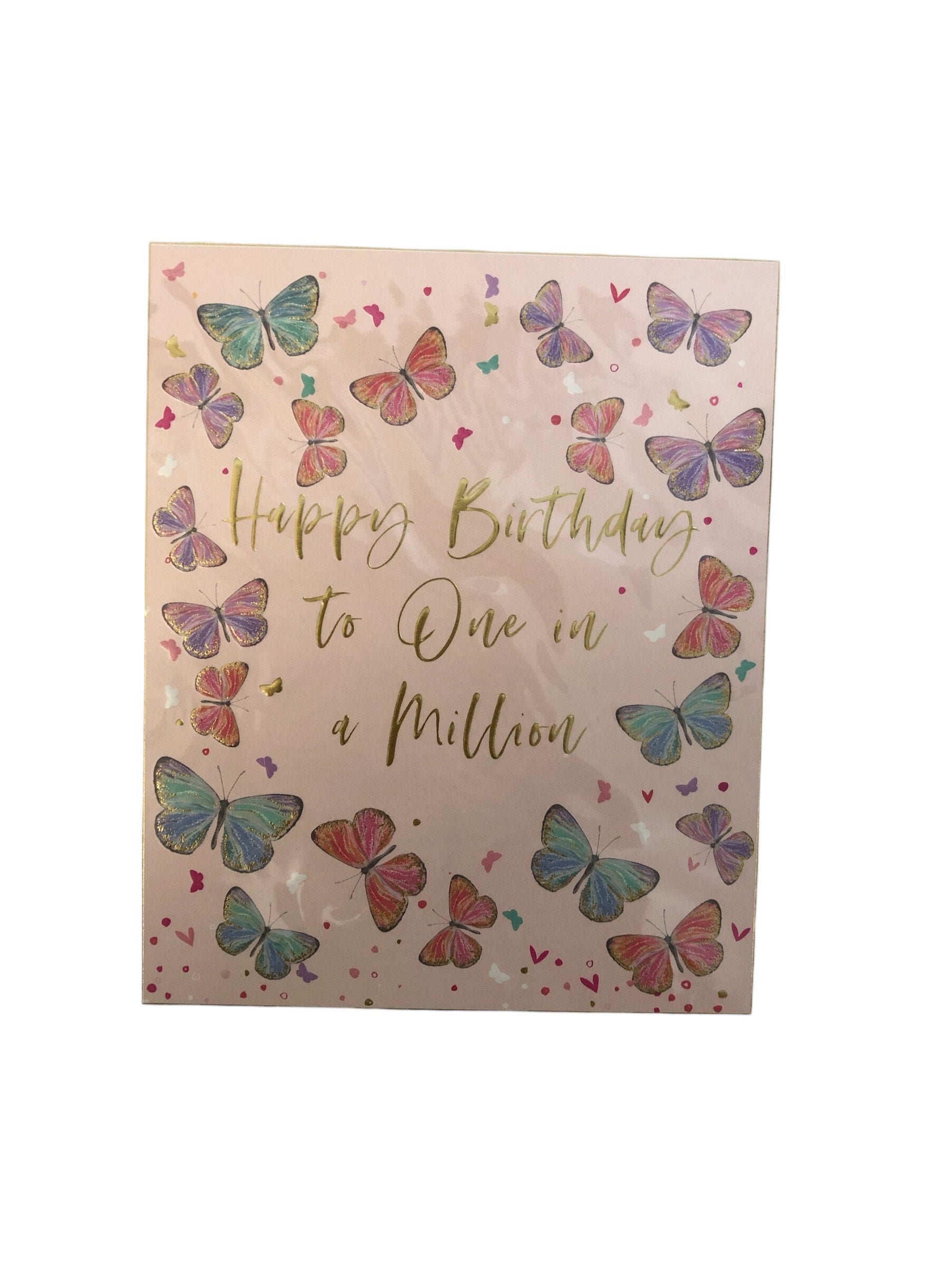 Beautiful pale pink card with tactile, glittered butterflies. Text on the front reads "Happy Birthday to One in a Million".