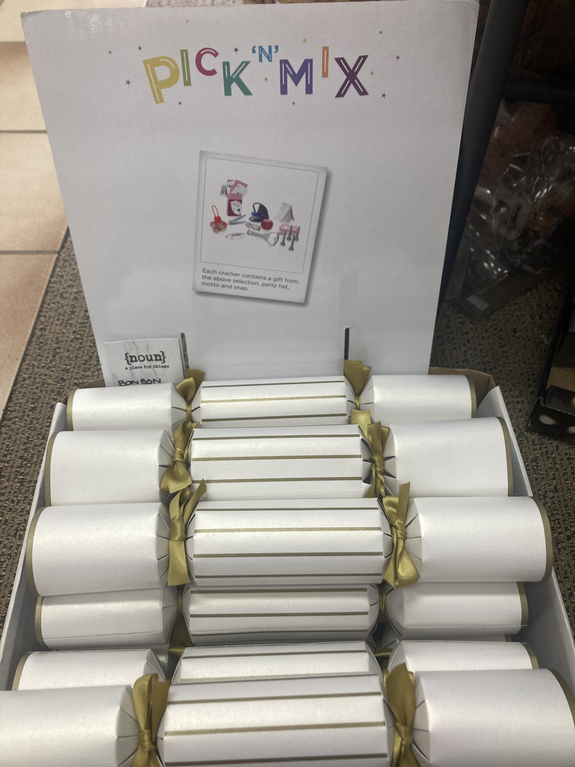 White and gold bon bons. Each cracker contains a gift. Sold individually.
