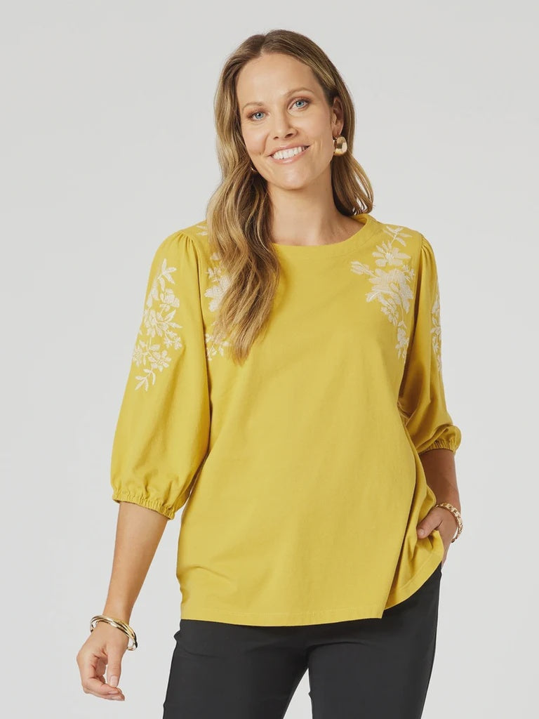 - The Jill Embroidered Tee features a flattering round neckline and 3/4 sleeves finished with soft elastic cuffs for a gently bloused effect.