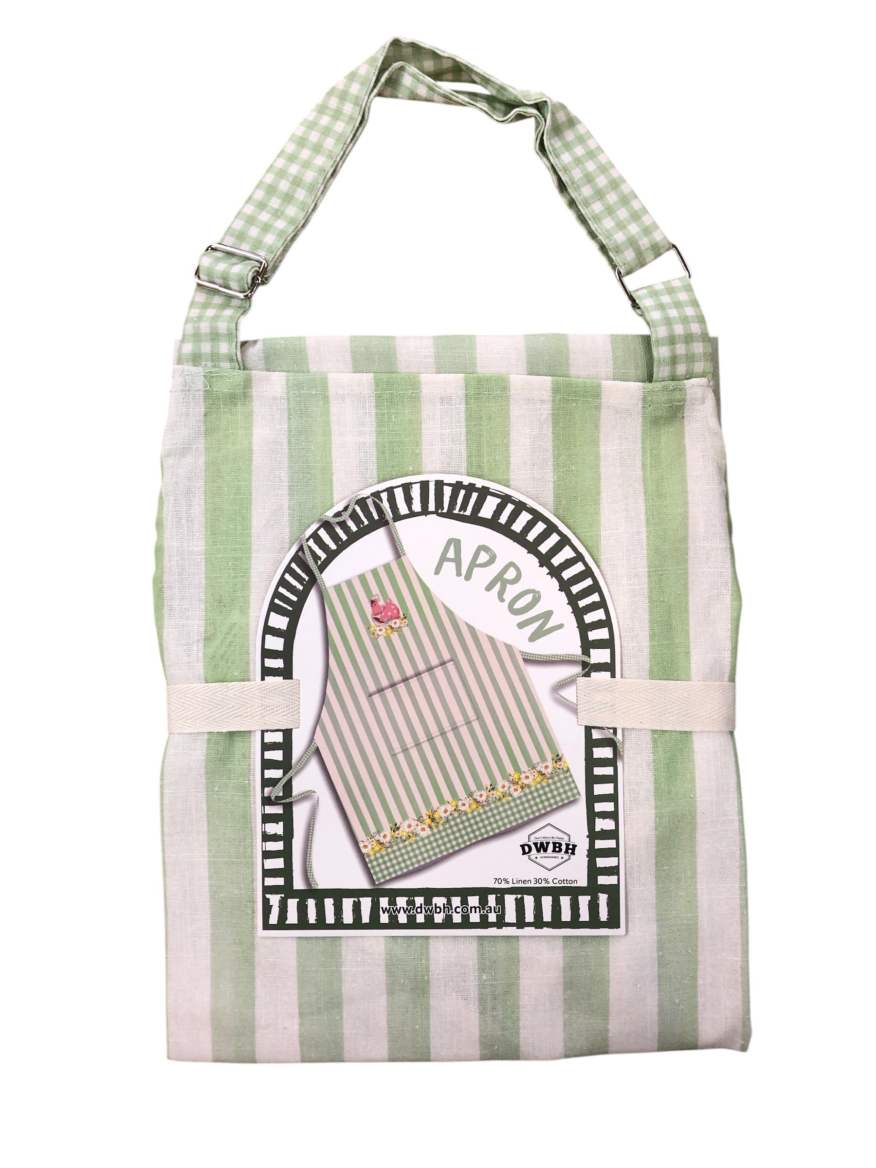 Lovely green & white stripes with a hen house character on the front & flowers along the bottom.