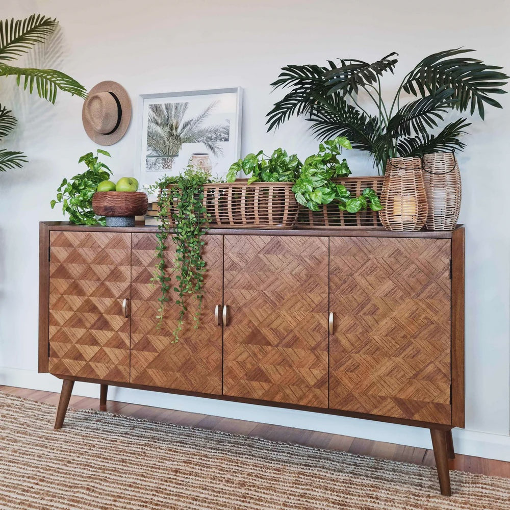 Classic and elegant, this piece has been expertly constructed with a bayur wood base with a coordinating geometric veneer design and brass hardware. This unique design is full of tone and texture and that is what sets Tasmin apart from the rest!