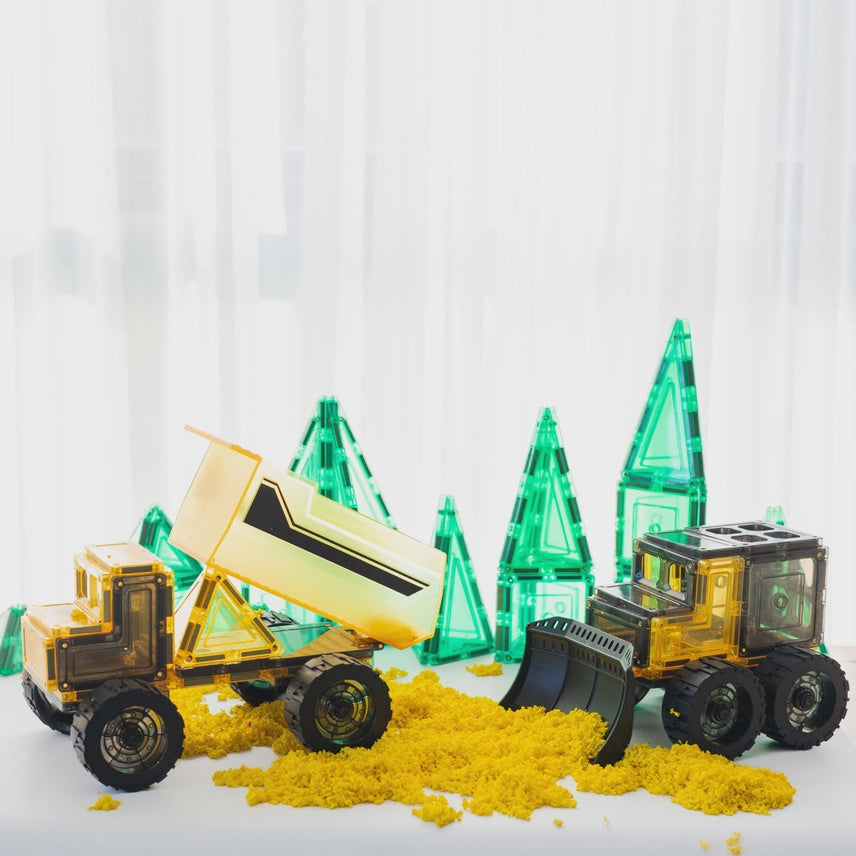 Get ready for serious play with our Mega Mover Pack, featuring a rugged Dump Truck and Bulldozer with patented locking pins on our 3x 1 Mega Mover Base, dozer attachment and wheel axle for maximum durability — perfect for indoor adventures or outdoor construction zones.