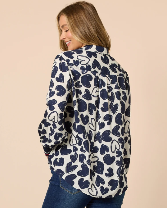 • Bring a touch of playful charm to your wardrobe with the Luna Heart Print Shirt.