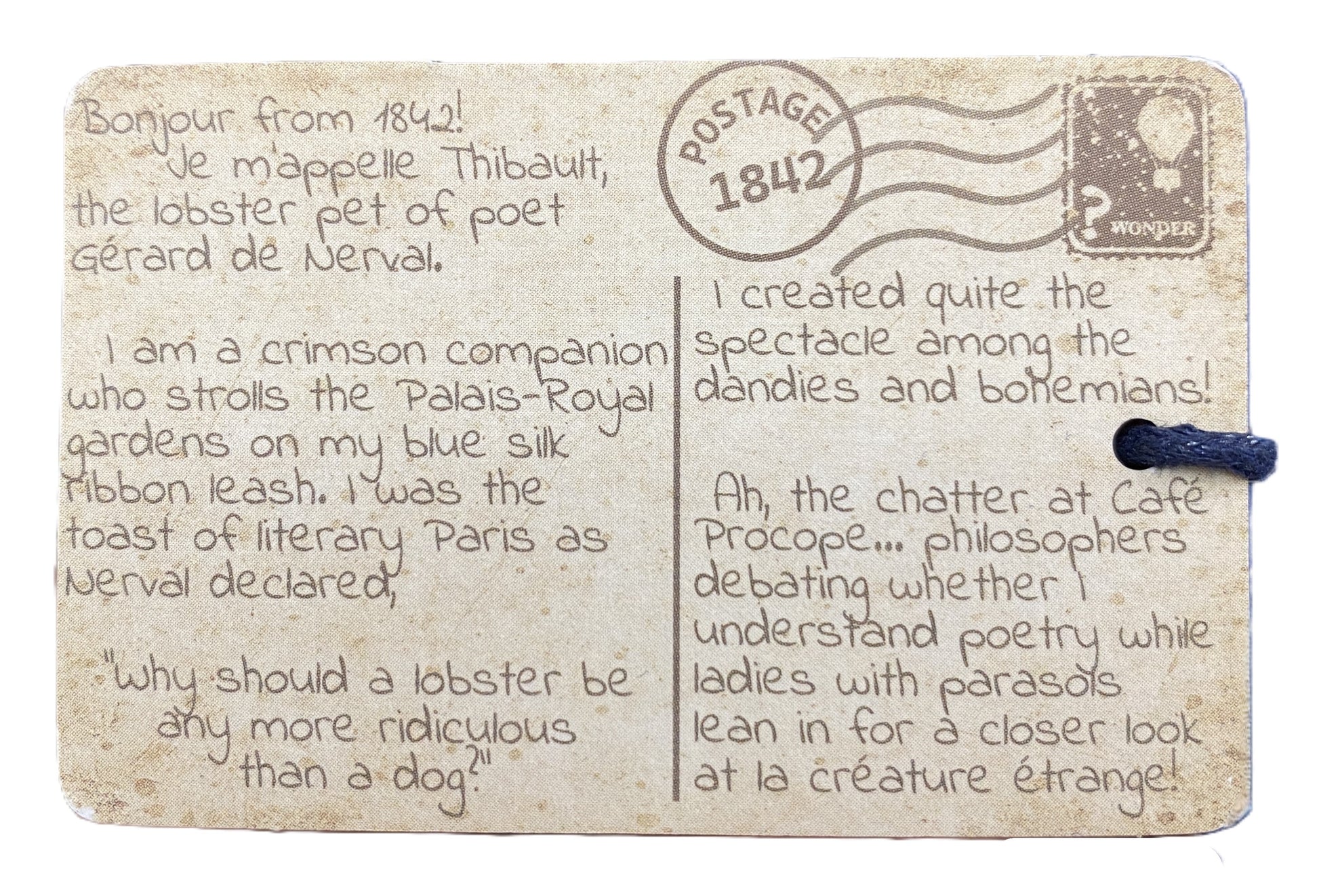 Scuttle back over 180 years with me, Thibault, an eccentric plush lobster from 1800s Paris. They say I once belonged to poet Gérard de Nerval, who paraded me through the Palais-Royal on a blue ribbon. Was I poetry in motion?