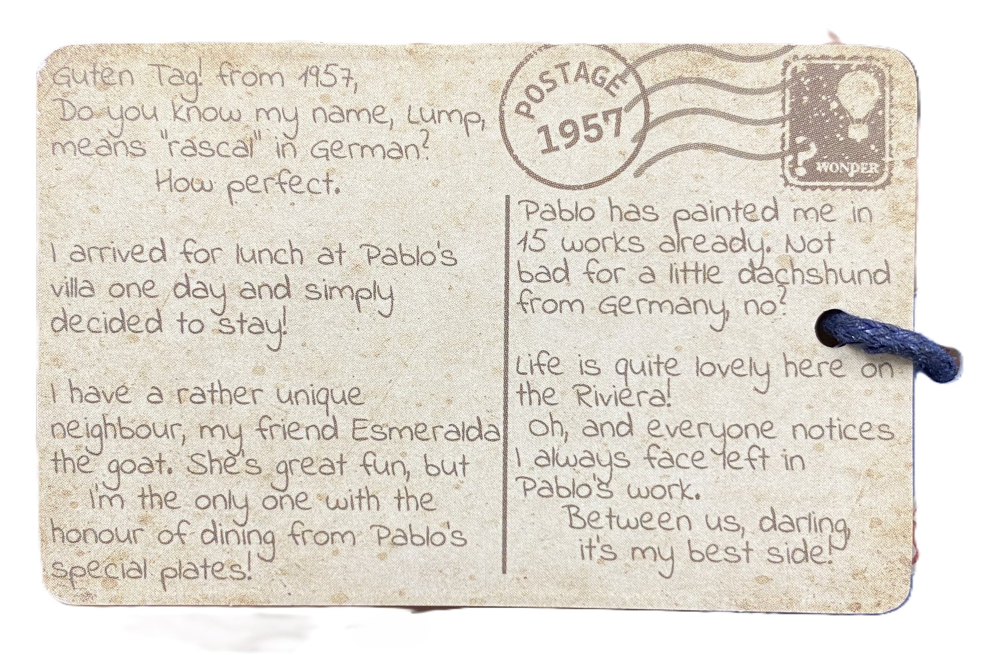 Dash back nearly 70 years with me. I’m Lump, the plush dachshund who strolled into Pablo’s villa in sunny Cannes and came to stay. With my short legs and big personality, did I inspire the world’s most influential?