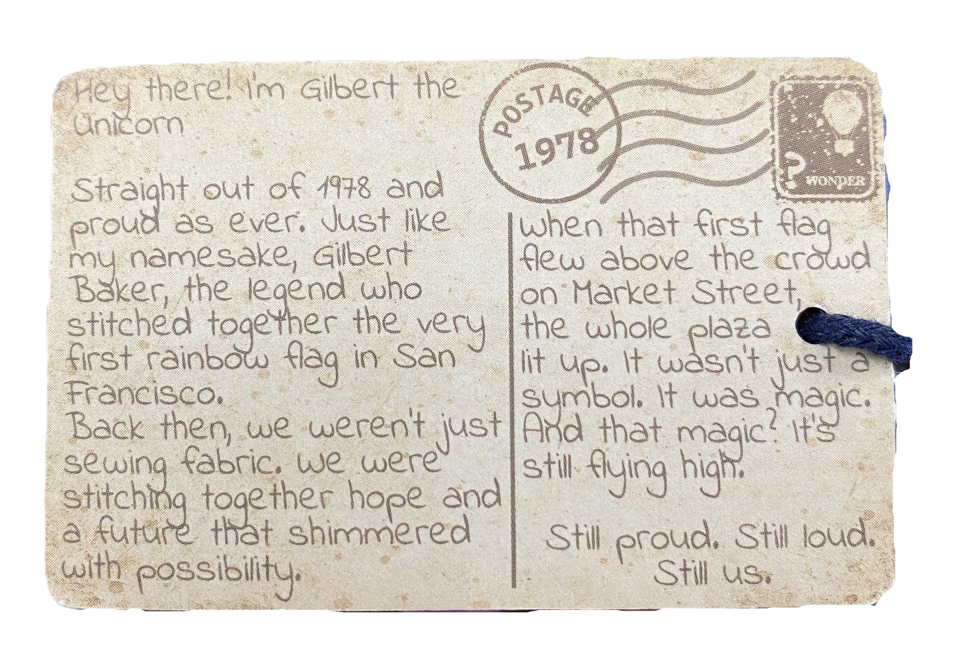 Parade back nearly 50 years with me, I'm Gilbert, the unicorn plush from 1970s San Francisco. With my rainbow mane and spark of pride, was I part of the magic that made rainbows last forever?